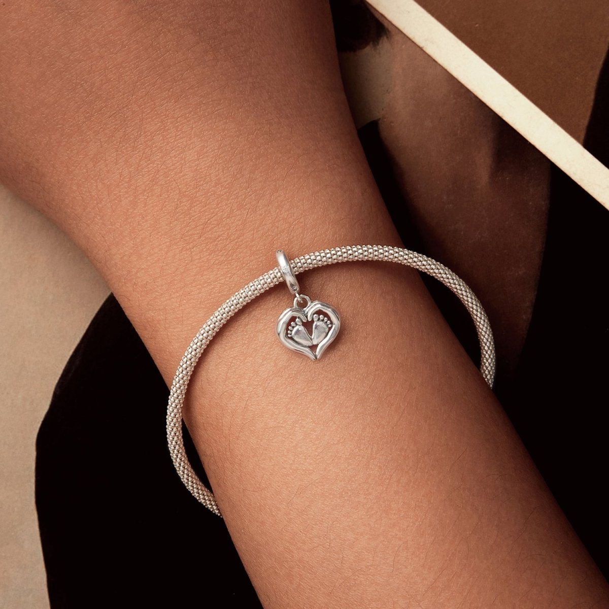 Celebrate the beauty of new life with the Baby Feet in Heart Hands Dangle Charm by Pangama Jewelry. This touching charm features a pair of delicate baby feet nestled within loving hands, forming a heart shape that symbolizes warmth, care, and the unbreakable bond between parent and child. Crafted with precision from high-quality 925 sterling silver, this sentimental piece is a perfect keepsake for mothers, grandmothers, or anyone cherishing the joy of a new arrival.