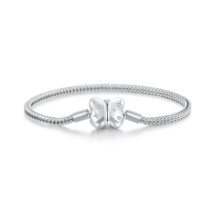 Embrace transformation and elegance with the Butterfly Sparkle Clasp Charm Bracelet by Pangama Jewelry. The detailed butterfly clasp is delicately engraved with starry accents and subtle stones, making it a symbol of hope and renewal. Paired with a sleek woven chain and crafted from 925 sterling silver, this bracelet offers grace and charm in every detail.