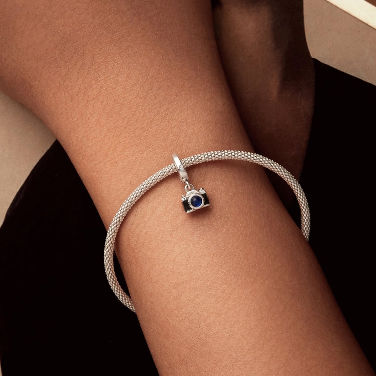 Capture memories with the Camera Dangle Charm by Pangama Jewelry. This delightful charm showcases a classic camera design, complete with intricate details and a blue gem representing the lens. Perfect for photography enthusiasts or those who cherish the art of capturing life’s special moments. Crafted from 925 sterling silver, it’s a beautiful way to commemorate the moments you’ve captured in time.