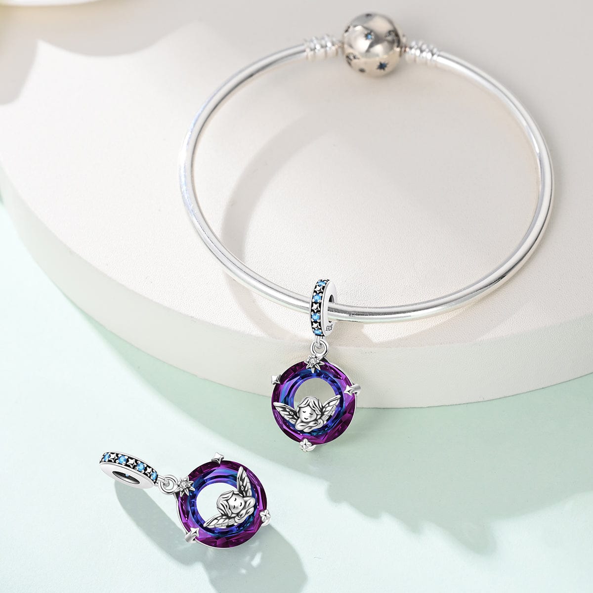Embrace the beauty of divine protection with the Celestial Angel Dream Charm by Pangama Jewelry. Crafted from 925 sterling silver, this enchanting design features a serene angel resting within a radiant circle of deep blue and violet crystals, symbolizing peace, guidance, and celestial wonder. Delicate star accents complete the charm, capturing the magic of the night sky and the gentle embrace of the heavens.