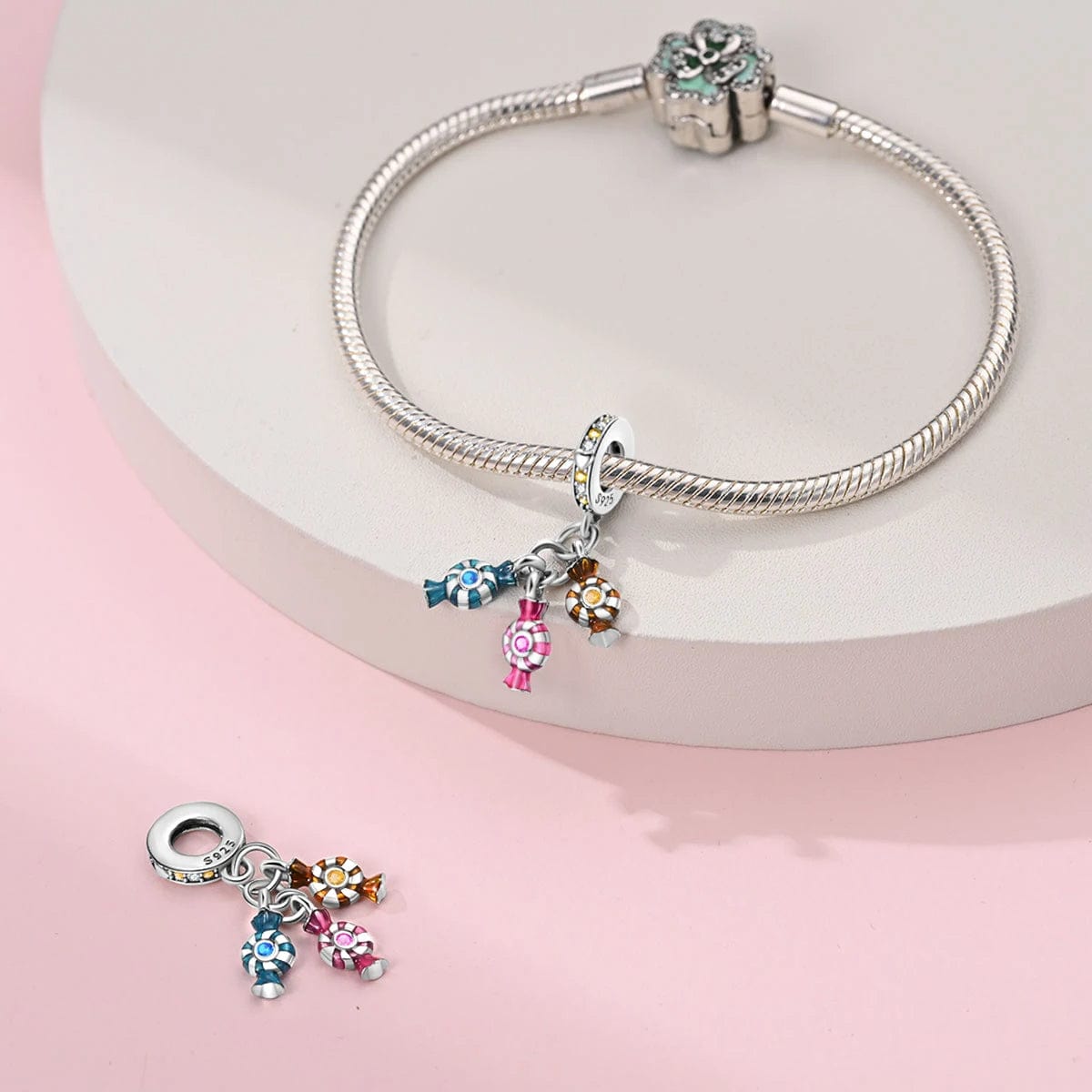 Satisfy your sweet tooth with the Colorful Candy Triple Dangle Charm by Pangama Jewelry. Crafted from 925 sterling silver, this delightful charm features three colorful candy dangles, each with its own unique design and vibrant colors. A perfect way to add a touch of fun and sweetness to your bracelet.
