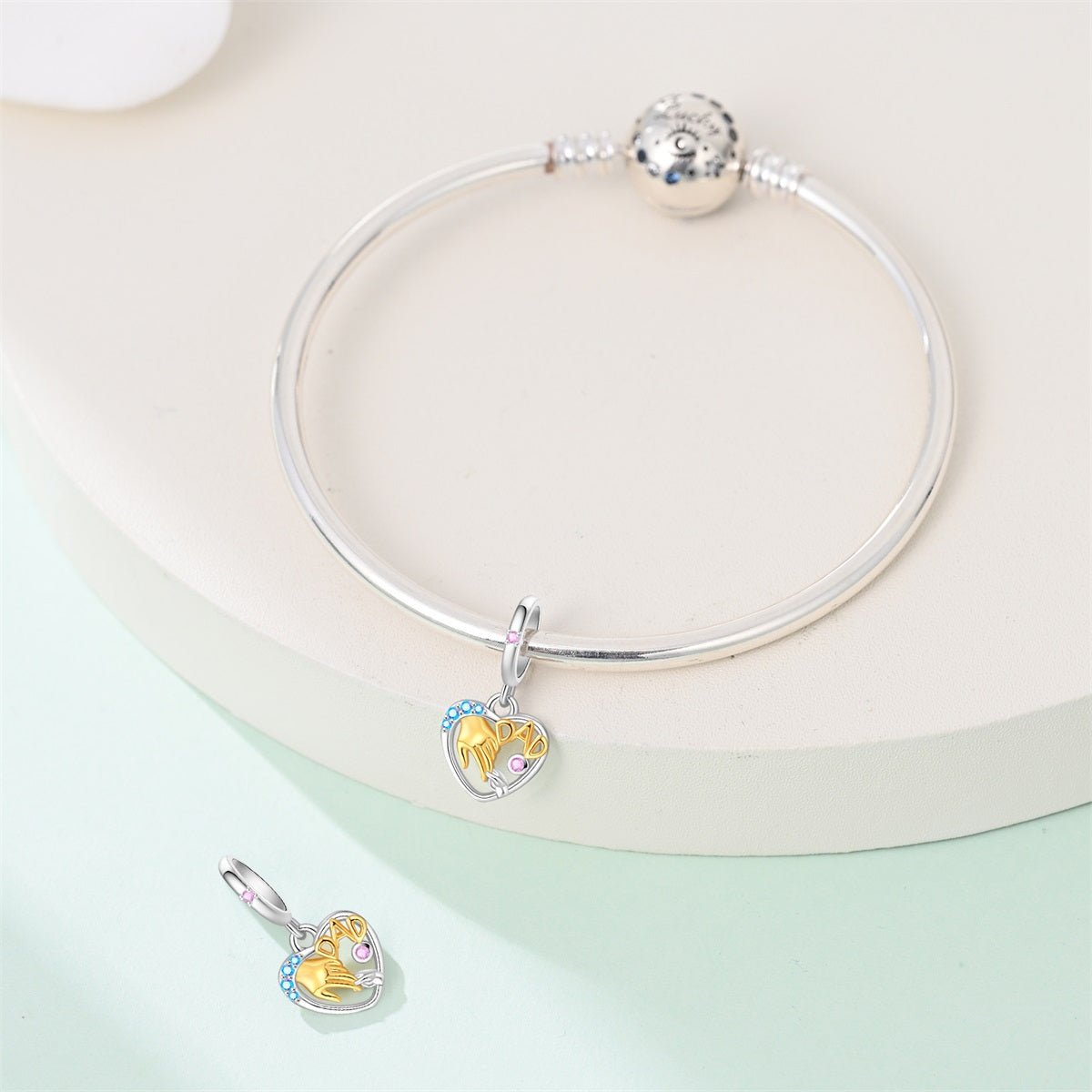 Celebrate the love and protection of a father’s touch with the Dad & Child Holding Hands Heart Dangle Charm by Pangama Jewelry. Crafted from 925 sterling silver, this touching charm features a golden hand marked “DAD” gently holding a tiny silver hand within a heart-shaped frame. Accented with blue and pink crystals, it’s a vibrant and emotional tribute to fatherhood and the bond that lasts a lifetime.