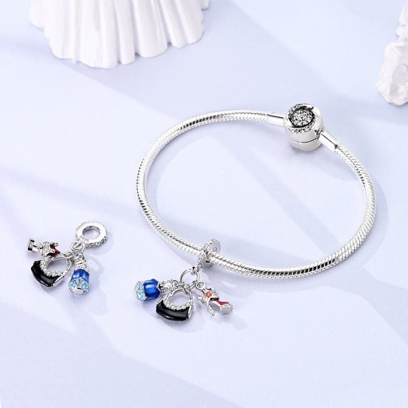 Add a touch of magic to your collection with the Dress, Purse & Red Slipper Triple Dangle Charm by Pangama Jewelry. Made from 925 sterling silver, this enchanting charm features three delightful dangles: a beautiful blue gown adorned with sparkling accents, a sleek black purse with clear stone details, and a red slipper that’s straight out of a fairytale. Whether you’re a lover of all things magical or just adore a touch of elegance, this charm will transport you to the world of dreams.