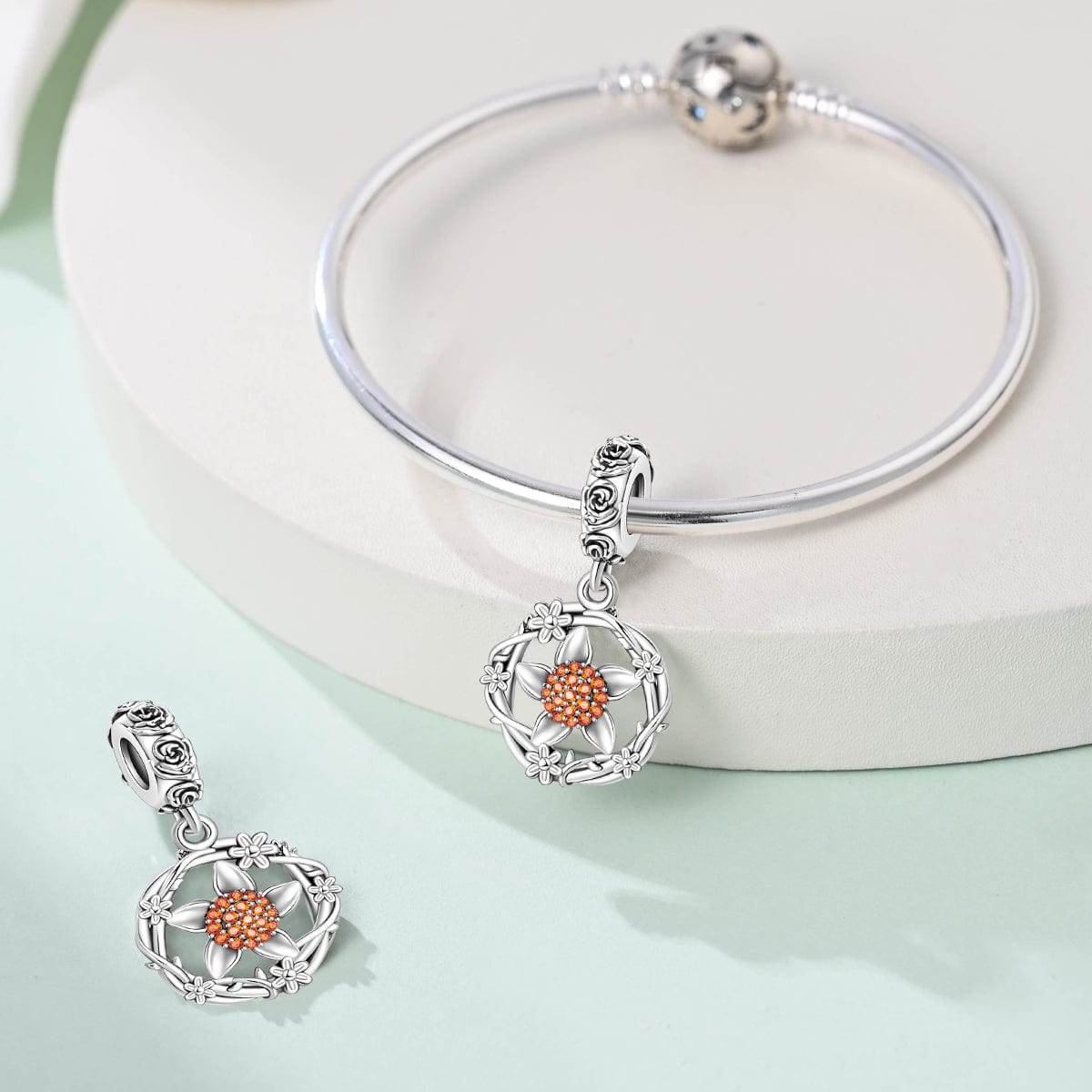Celebrate the beauty of nature with the Floral Blossom Wreath Dangle Charm by Pangama Jewelry. Crafted from 925 sterling silver, this elegant design features a finely detailed flower encircled by a delicate wreath of blossoms, symbolizing growth and renewal. Shimmering orange pavé stones at the center add a warm, radiant glow, while intricate rose engravings on the bail bring a touch of sophistication.