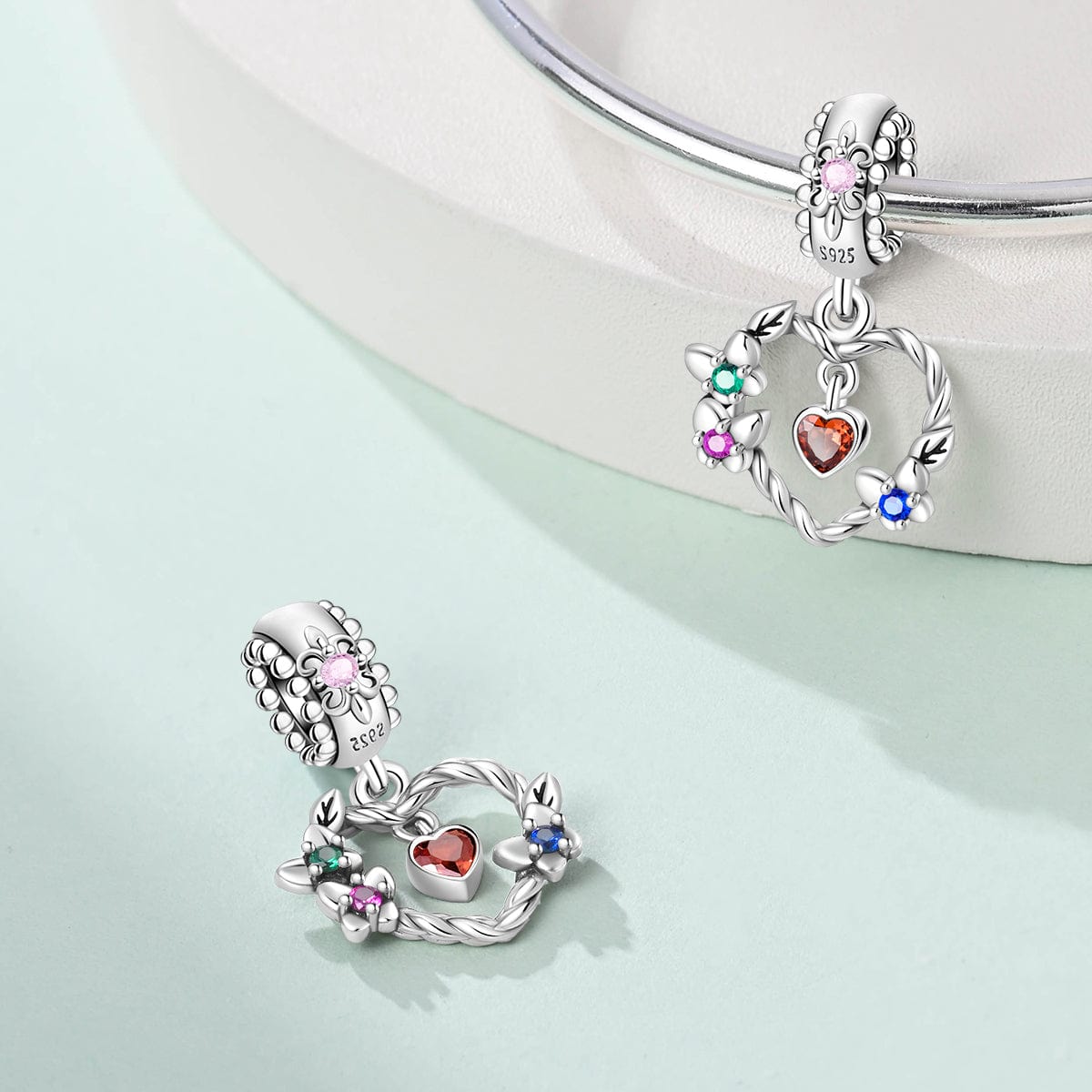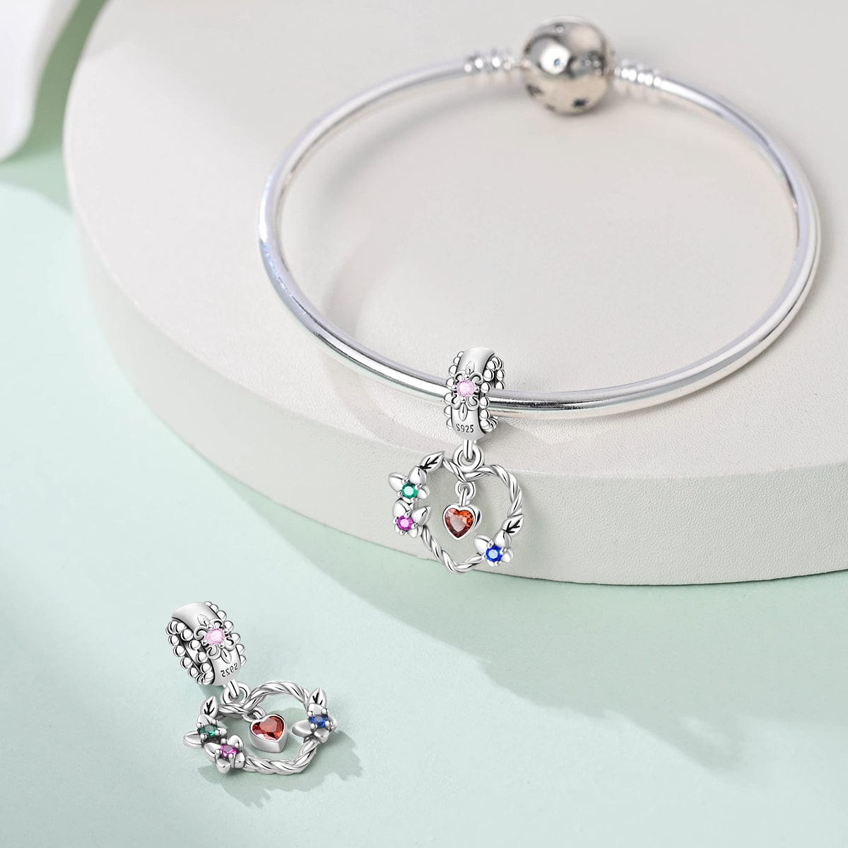 Celebrate nature’s beauty with the Floral Wreath & Heart Dangle Charm by Pangama Jewelry. Crafted from 925 sterling silver, this enchanting design features a twisted wreath adorned with delicate flowers, symbolizing love and renewal. At its center, a radiant heart-shaped gemstone adds a warm, sentimental touch, while multicolored cubic zirconia accents bring a subtle sparkle.