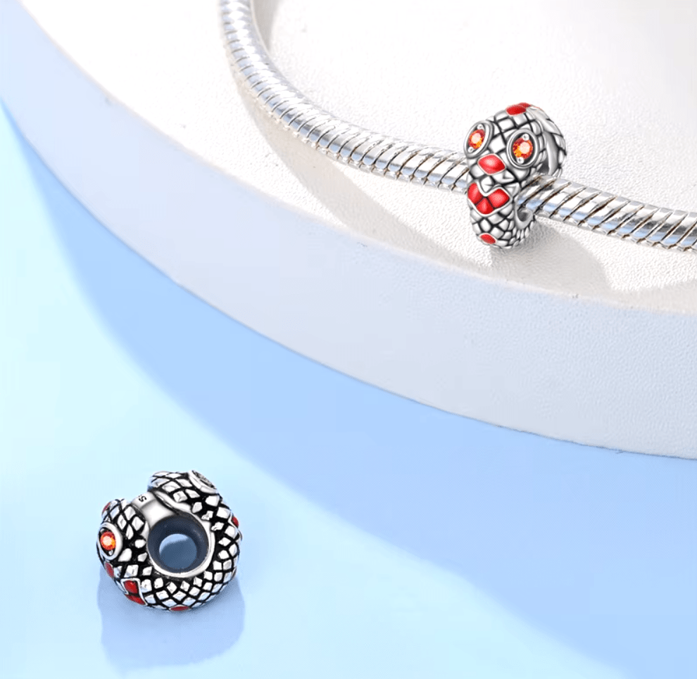 Embrace the allure of the Glowing Ruby-Eyed Snake Charm by Pangama Jewelry. This 925 sterling silver charm features a snake with glowing ruby-red eyes, symbolizing mystery and transformation.