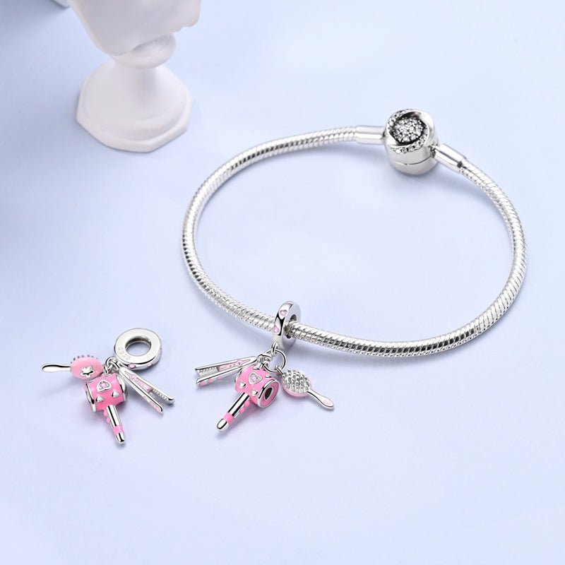 Celebrate your passion for hairstyling with the Hairdresser's Styling Tools Triple Dangle Charm by Pangama Jewelry. This beautifully crafted 925 sterling silver charm features three intricately designed dangles—a pink hairdryer, a sleek straightener, and a stylish hairbrush—each adorned with sparkling accents. Whether you're a professional stylist or simply love creating stunning hairstyles, this charm is a perfect tribute to your creativity and dedication.