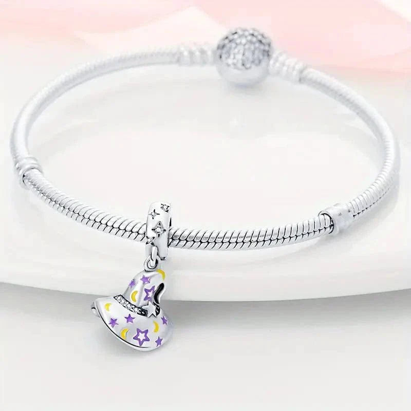 Celebrate the fun of Halloween with the Halloween Hat Dangle Charm by Pangama Jewelry. Made from 925 sterling silver, this charm features a whimsical Halloween hat decorated with stars and moons in bright, festive colors, perfect for the spooky season.