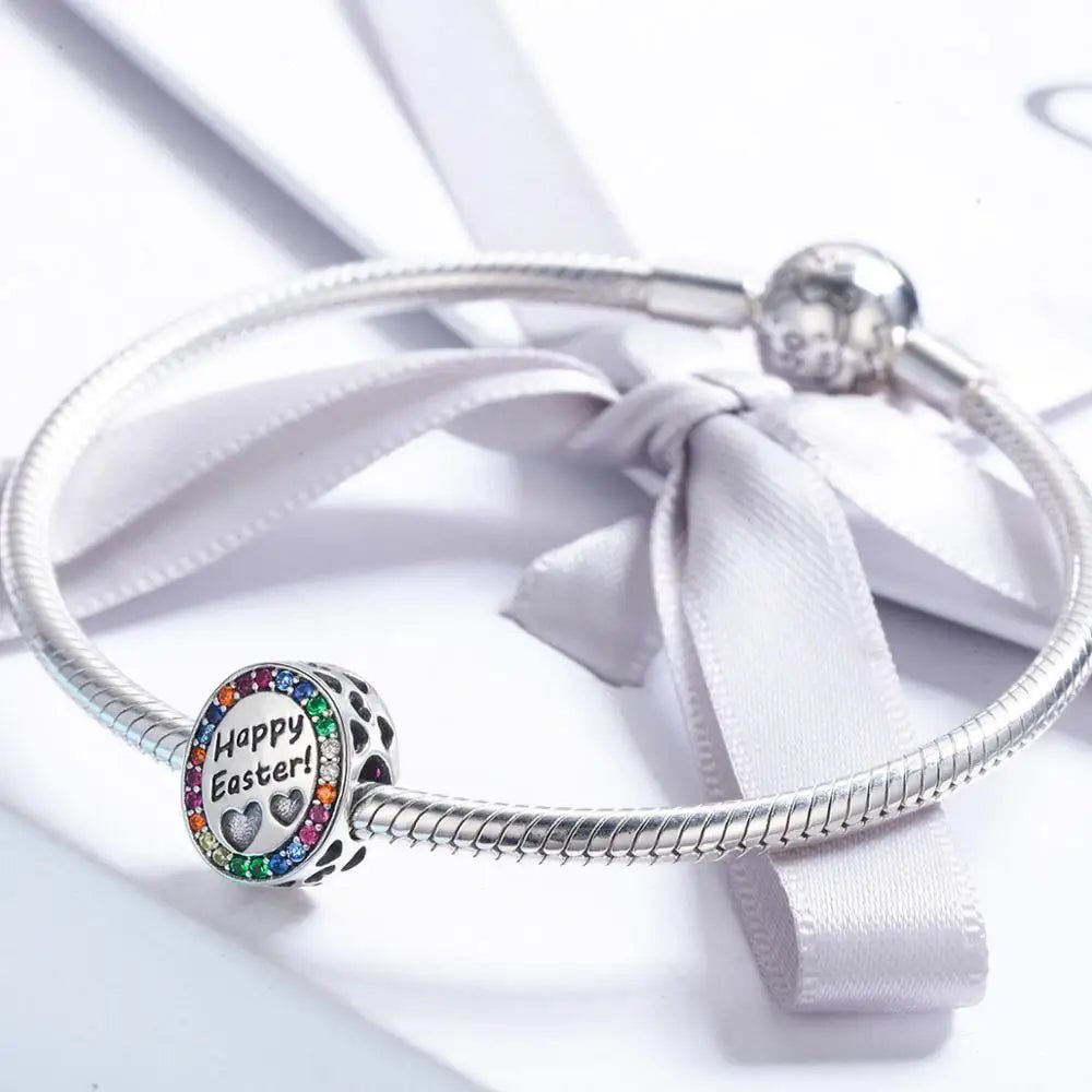 Celebrate the joy of Easter with the Happy Easter Egg Charm by Pangama Jewelry. This charm features a vibrant, multicolored design with a cheerful “Happy Easter!” inscription and two hearts. The egg-shaped charm is beautifully embellished with sparkling gemstones in a rainbow of colors, adding a festive touch to your collection. Made from 925 sterling silver, this charm is the perfect way to commemorate Easter or add a pop of color to your bracelet or necklace.