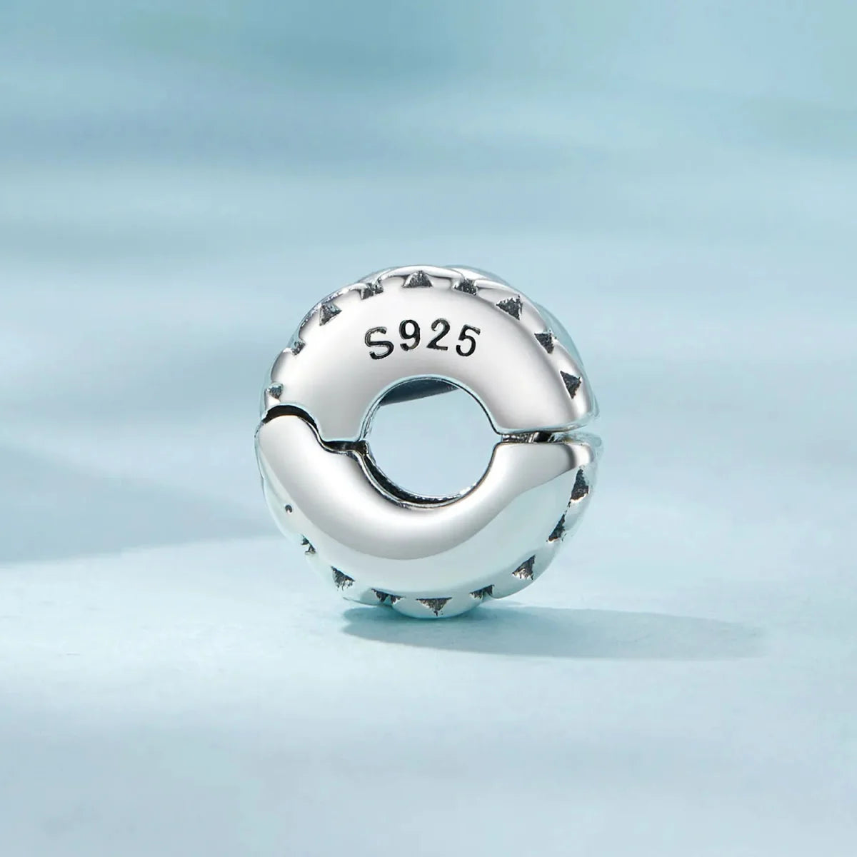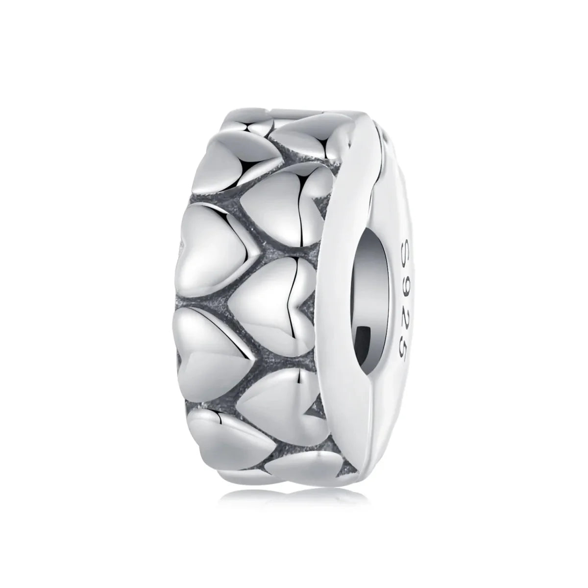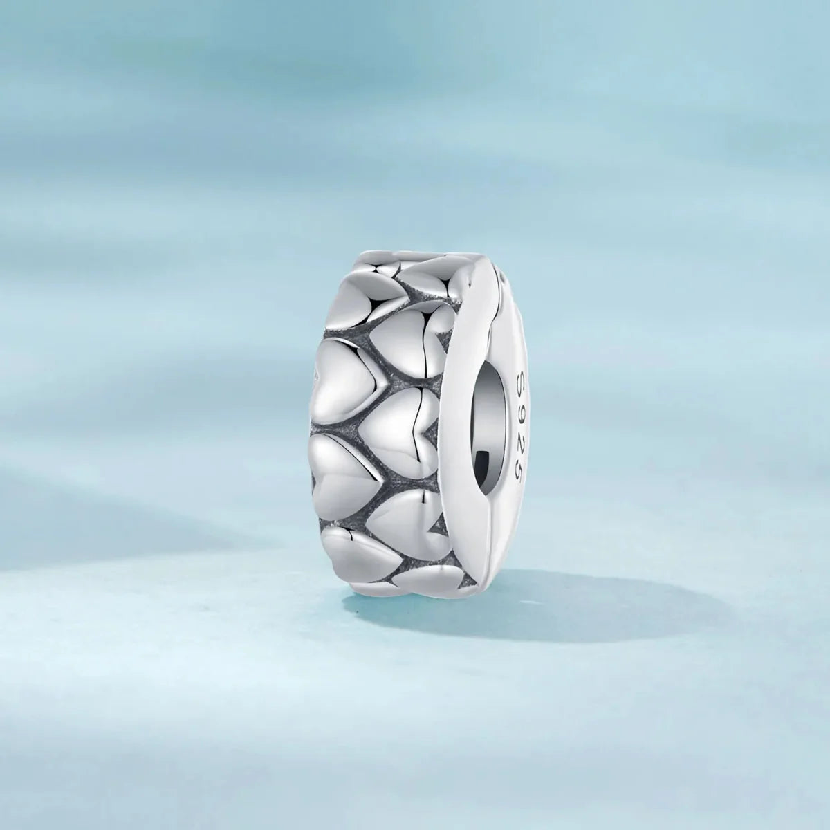 Keep love in place with the Heart Pattern Clip Charm by Pangama Jewelry. Crafted from 925 sterling silver, this sleek charm features a textured band of sculpted hearts in a polished finish, creating a subtle yet meaningful symbol of affection. Designed as a functional clip, it helps balance your bracelet while adding a refined touch of romance.