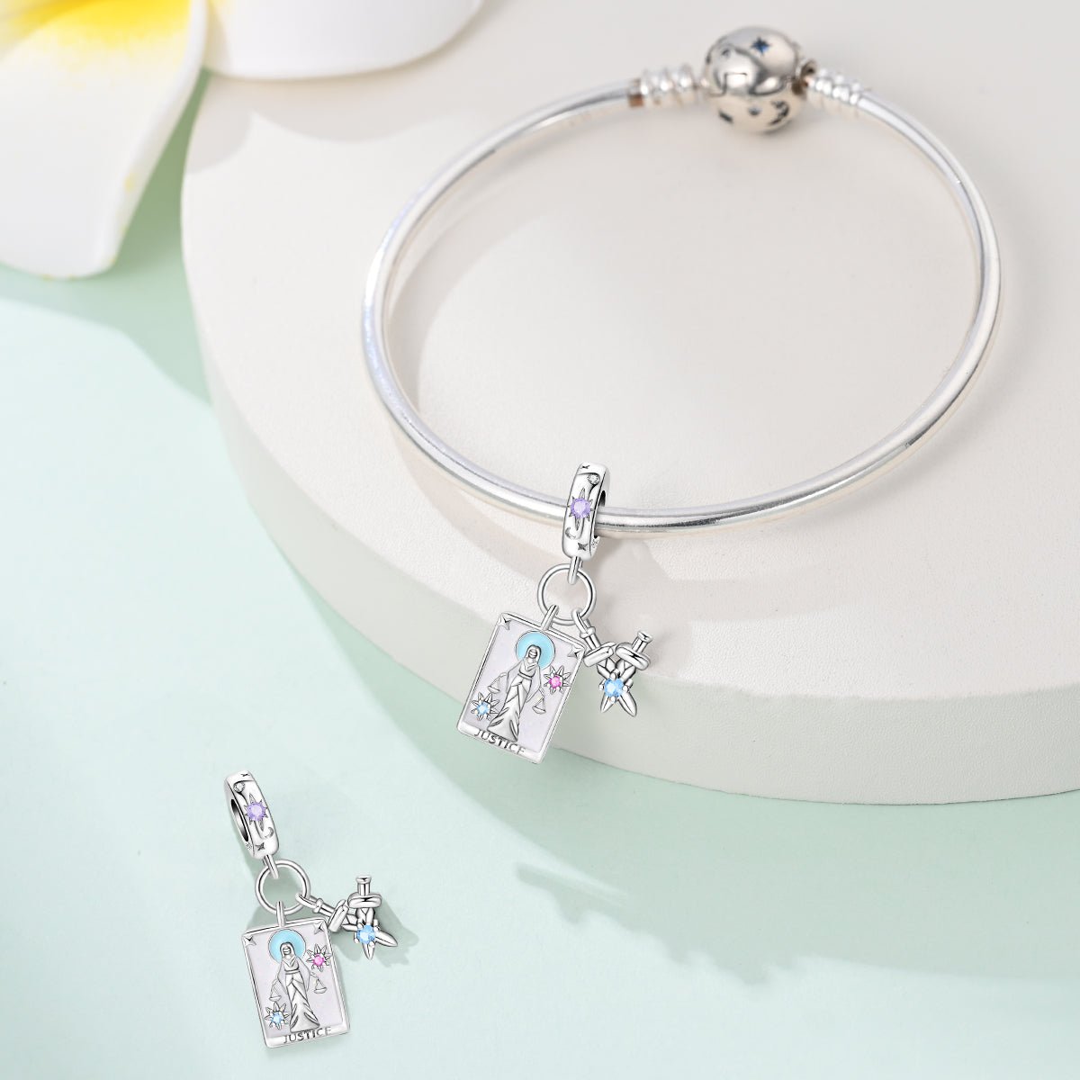 Find balance and clarity with the Justice Tarot Card & Sword Dangle Charm by Pangama Jewelry. Crafted from 925 sterling silver, this charm features the Justice tarot card, which symbolizes fairness, truth, and integrity. The Lady Justice image is complemented by a sword and scales, while delicate blue and pink gemstones reflect wisdom and harmony.