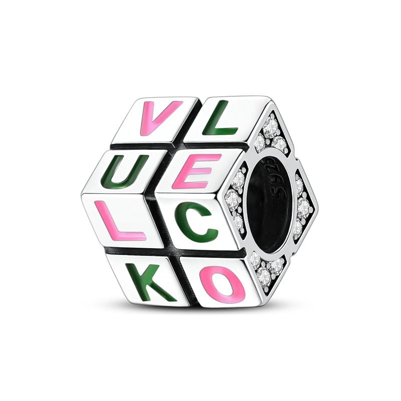 Bring charm and positivity to your bracelet with the Love Luck Letter Cube Charm by Pangama Jewelry. Crafted from 925 sterling silver, this unique cube design features colorful enamel letters in pink and green that spell out "LOVE" and "LUCK" across multiple sides. Sparkling pavé stones on the edges add a dazzling touch to this modern, multidimensional piece.