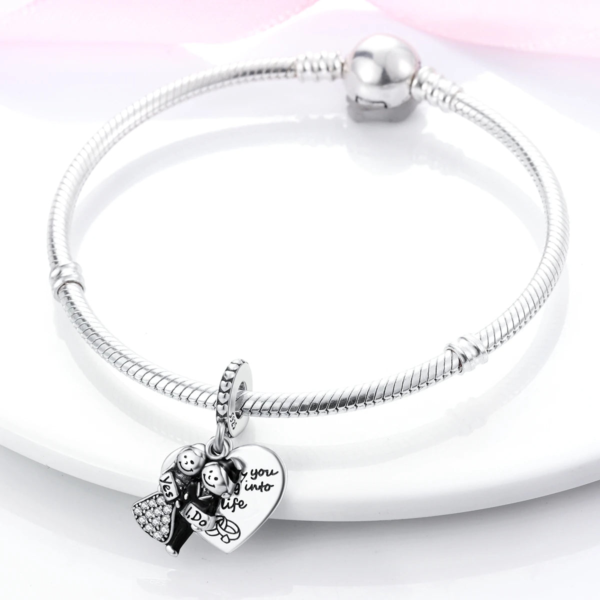 Celebrate love and commitment with the Married Couple Dangle Charm from Pangama Jewelry. Crafted from 925 sterling silver, this exquisite charm features a joyful bride and groom, with the bride’s gown adorned in sparkling cubic zirconia. A heart-shaped accent is engraved with the heartfelt phrase, "Yes, I do," alongside two interlocking wedding rings, symbolizing eternal love and devotion.