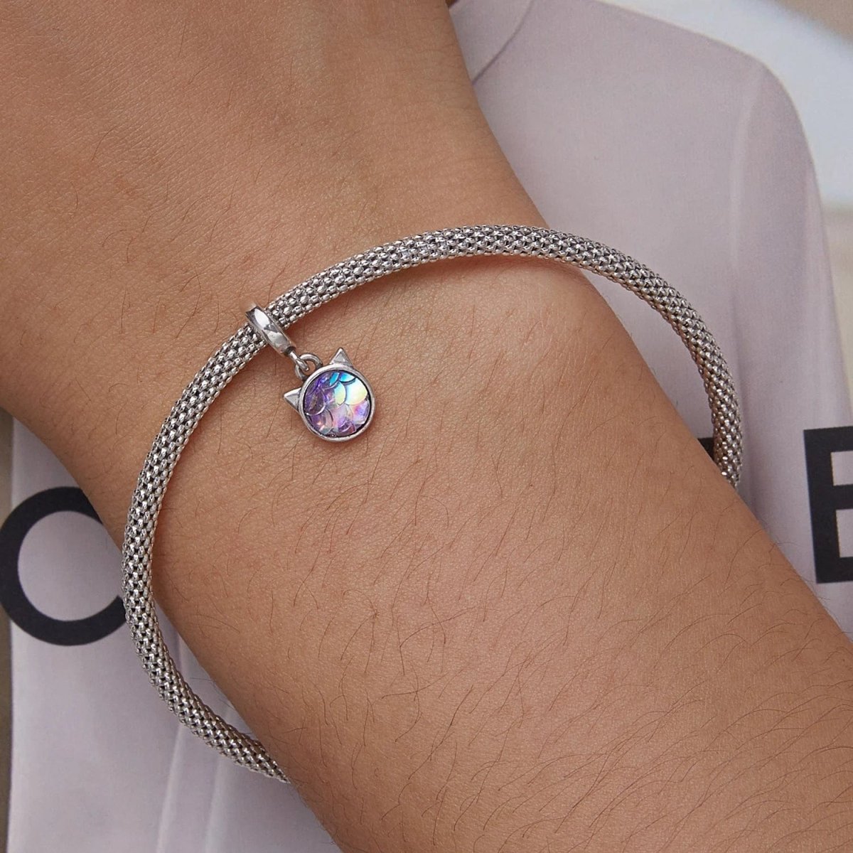Step into a world of mystery and magic with the Mystical Cat Dangle Charm by Pangama Jewelry. Crafted from 925 sterling silver, this enchanting charm features a shimmering iridescent centerpiece framed by delicate cat ears, symbolizing intuition, independence, and grace.