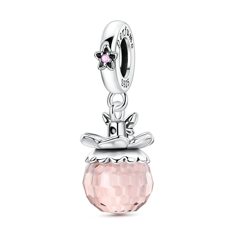 Celebrate elegance and femininity with the Pink Crystal Perfume Bottle Dangle Charm by Pangama Jewelry. This delicate design features a faceted pink crystal bottle topped with a silver bow and atomizer cap, capturing the essence of timeless beauty. Engraved with "perfume" and adorned with a tiny pink stone-set flower on the bail, this charm adds a fragrant touch of charm to any bracelet.