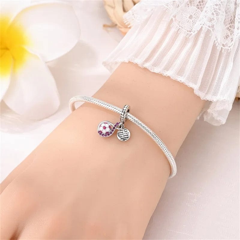Show your love for the game with the Pink Soccer Dangle Charm by Pangama Jewelry. Crafted from 925 sterling silver, this vibrant charm features a pink soccer ball adorned with pink crystals and an inspiring message engraved on the charm. Perfect for soccer lovers, this charm adds a playful and sporty touch to your collection.