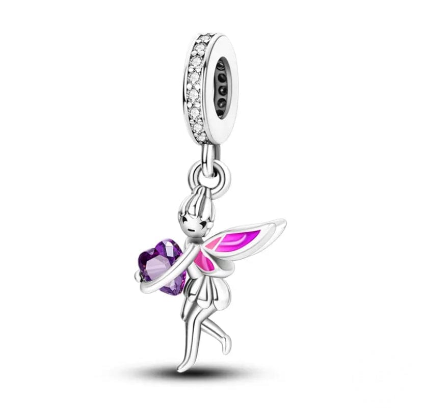 Add a touch of enchantment to your bracelet with the Purple Crystal Heart Fairy Charm by Pangama Jewelry. Crafted from 925 sterling silver, this charm features a delicate fairy with sparkling purple crystal wings and a heart-shaped design. Perfect for those who believe in magic, this charm brings a touch of whimsy and elegance to your collection.