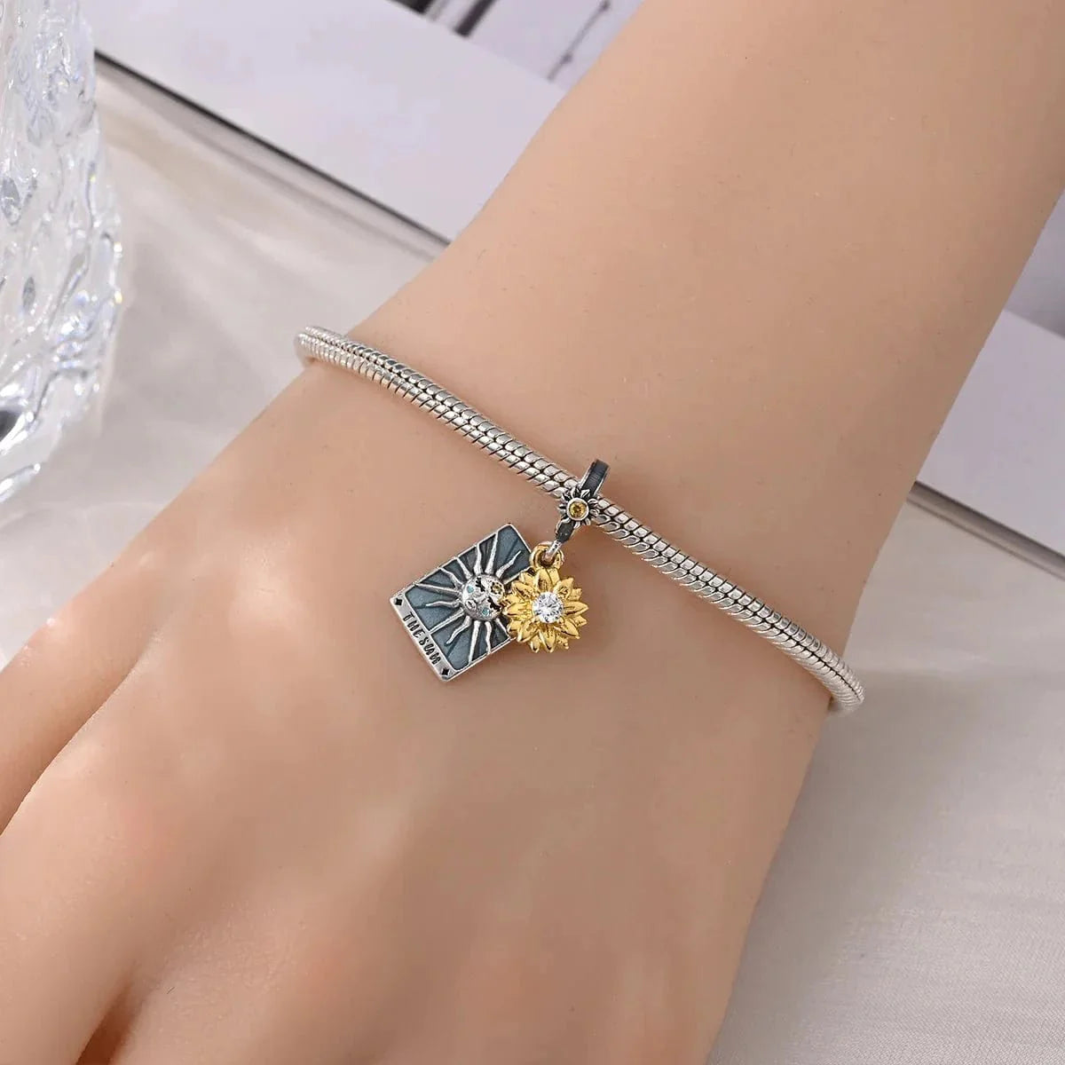 Let the Radiant Sun Tarot Card Dangle Charm by Pangama Jewelry illuminate your style. Made from 925 sterling silver, this charm features the powerful image of the sun from a tarot card, symbolizing positivity, energy, and enlightenment.