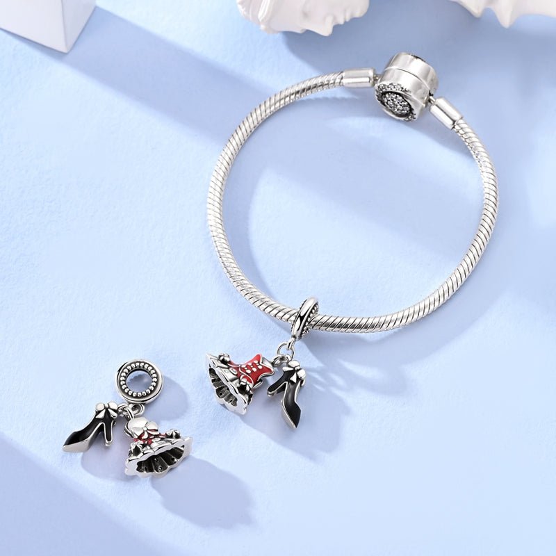 Step into elegance with the Red Dress & Black Heels Dangle Charm by Pangama Jewelry. Crafted from 925 sterling silver, this chic charm features a flared red enamel dress adorned with sparkling accents and playful bow details, paired with a glossy black enamel stiletto topped with a dainty bow. The perfect combination of fashion and glamour, this charm celebrates confidence, femininity, and timeless style.