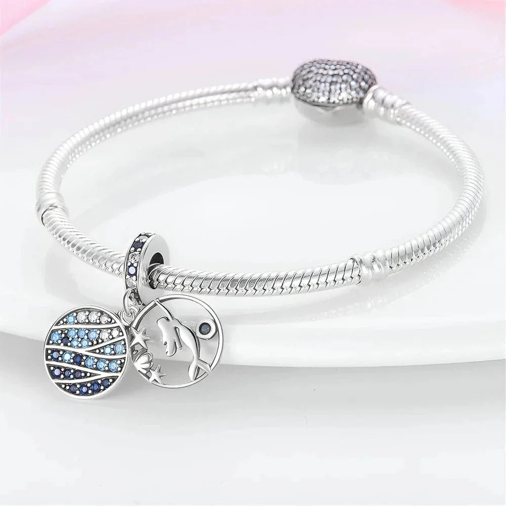 Dive into the deep blue with the Shimmering Ocean Blue Mermaid Dangle Charm by Pangama Jewelry. Crafted from 925 sterling silver, this charm features a beautifully detailed mermaid set against a shimmering ocean backdrop, perfect for ocean and fantasy lovers.