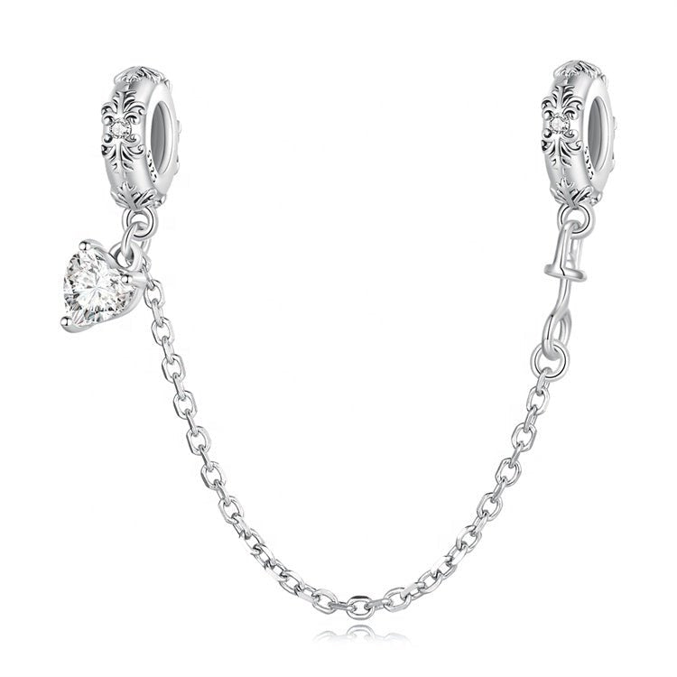 Add elegance and peace of mind to your bracelet with the Sparkling Pavé Safety Chain Charm by Pangama Jewelry. Designed to keep your charm bracelet secure, this piece features a beautifully sculpted chain anchored by two intricate stoppers, one adorned with a dazzling heart-cut cubic zirconia. The ornate floral engravings and subtle shine offer a perfect balance of style and functionality. Crafted from 925 sterling silver, it ensures both beauty and bracelet protection.