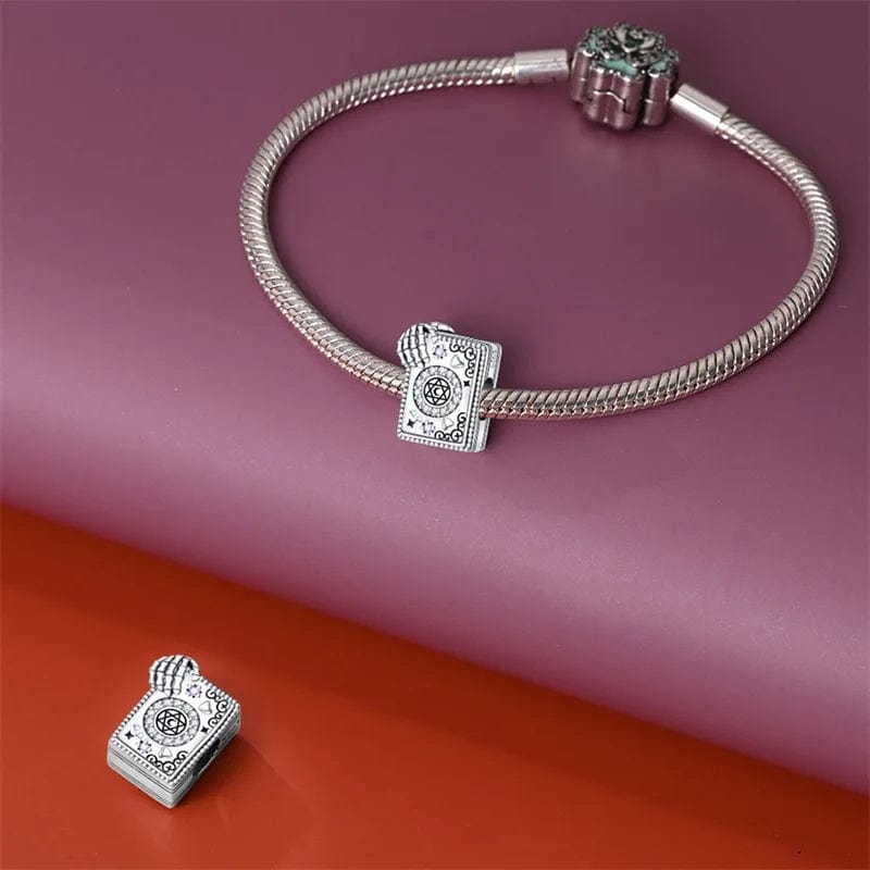 Unlock the secrets of Halloween with the Spooky Skeleton Secrets Book Charm by Pangama Jewelry. Crafted from 925 sterling silver, this charm features a skeleton hand holding an open book filled with Halloween-themed details. A must-have for fans of spooky tales and mystical charm.