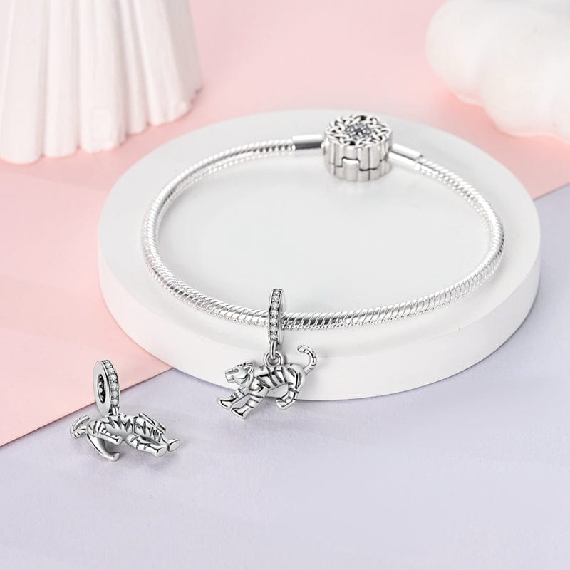 Unleash your wild side with the Striped Tiger Dangle Charm by Pangama Jewelry. Crafted from 925 sterling silver, this charming tiger features intricate black stripes and a fierce pose. With sparkling cubic zirconia accents, this playful charm captures the spirit of adventure and beauty, making it the perfect addition to your collection.